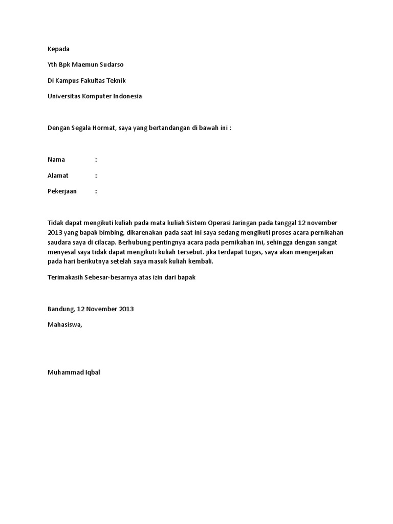 Pembuatan surat izin bertujuan untuk kepentingan izin tidak masuk sekolah, kuliah ataupun kerja. Kepada yth, bapak muhammad ilham. Langsung saja kita mulai pembahasan kali ini yaitu contoh surat izin kerja ,tidak masuk sekolah, dan surat izin kuliah. Sesuai dengan namanya, surat izin tidak masuk kuliah adalah surat yang dibuat oleh mahasiswa, yang dimaksudkan untuk meminta izin kepada pihak kampus karena tidak dapat mengikuti kegiatan perkuliahannya. Dalam menulis surat izin kuliah, maka anda bisa mengirimkan kepada pihak kampus, kepada wali mahasiswa, ataupun kepada dosen tertentu.