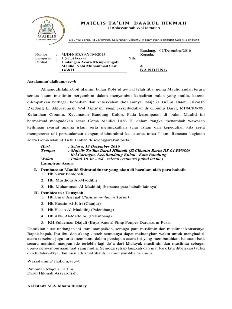 Dalam membuat surat undangan, selain bahasa yang sopan juga jangan lupa dalam surat undangan itu mengandung 3 komponen berikut: Undangan acara maulid nabi muhammad saw. Contoh desain surat undangan halal bihalal lewat whatsapp pdf. Contoh undangan maulid nabi bahasa inggris. Pdf contoh surat undangan tahlil 40 100 1000 hari haul.